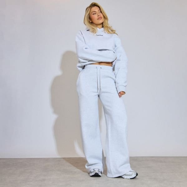 Refresh your off-duty look with these light grey marl wide leg joggers. Crafted from soft fleece material, they feature a low rise fit and essential graphic detailing. Perfect for pairing with a cropped hoodie and trainers for a casual day or a fitted top and boots for a more polished look.