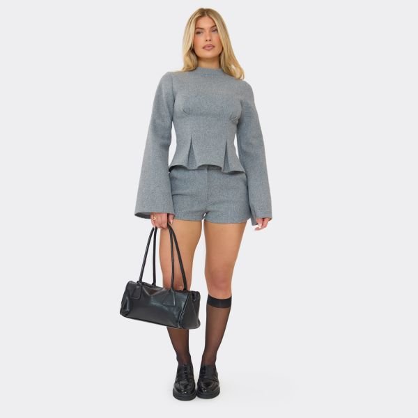 Perfect for casual days or coffee runs, this pair features grey wool-look fabric with a mid-rise waist and tailored short fit for a chic, on-trend finish. Pair with a knit top or blazer and ankle boots for effortless it-girl energy.