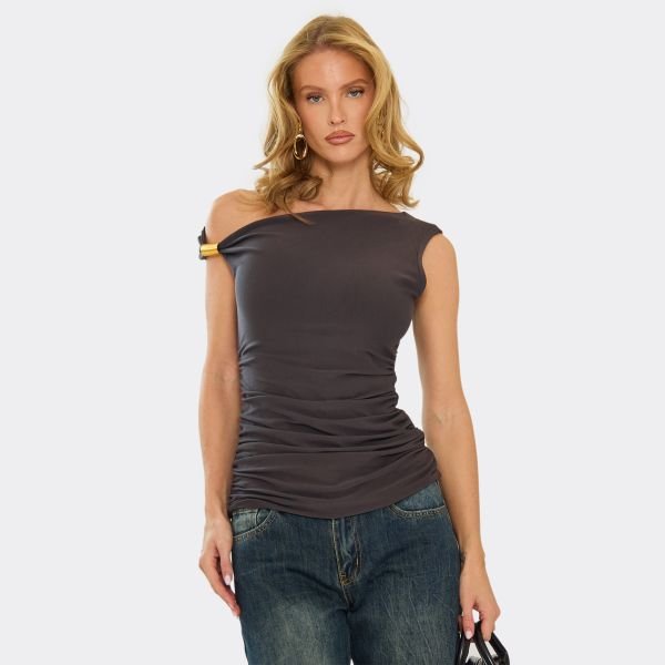 The EGO One Shoulder Ruched Trim Detail Top in Charcoal Grey is ideal for casual, brunch, day drinks.