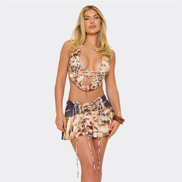 Turn heads in this animal print top, featuring a plunge cowl neck and sleek trim detailing for a bold, chic vibe that’s ready for the spotlight.