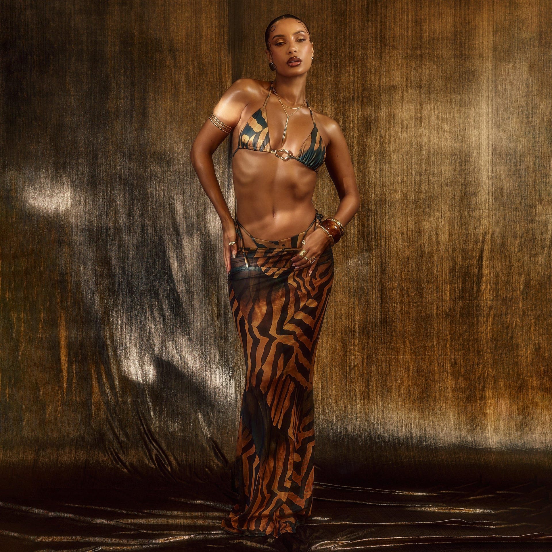 “Pair with a matching bikini and gold jewelry for a polished beach look.”