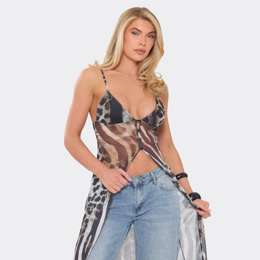 Striking multi animal print mesh top with a button-down front and adjustable straps. Perfect for a bold, edgy look.