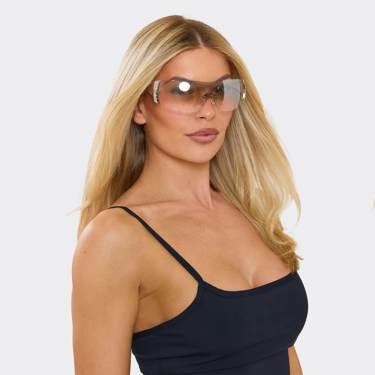 Elevate your summer look with these EGO frameless sunglasses featuring a silver metal frame and diamante detailing. The clear lenses offer a modern touch perfect for beach outings. Style with a bikini and sarong for a beach club vibe.