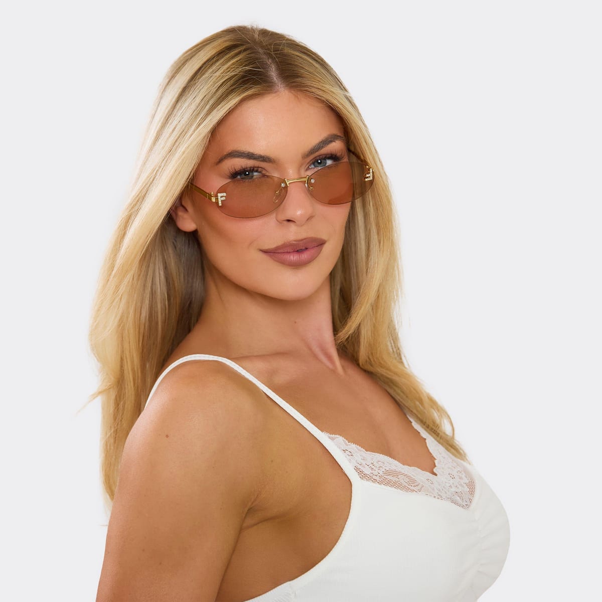 Elegant nude tinted lens sunglasses with diamante detailing and an oval shape. Ideal for summer, pair with a matching hue bikini and a beach cover-up for a stylish holiday look.