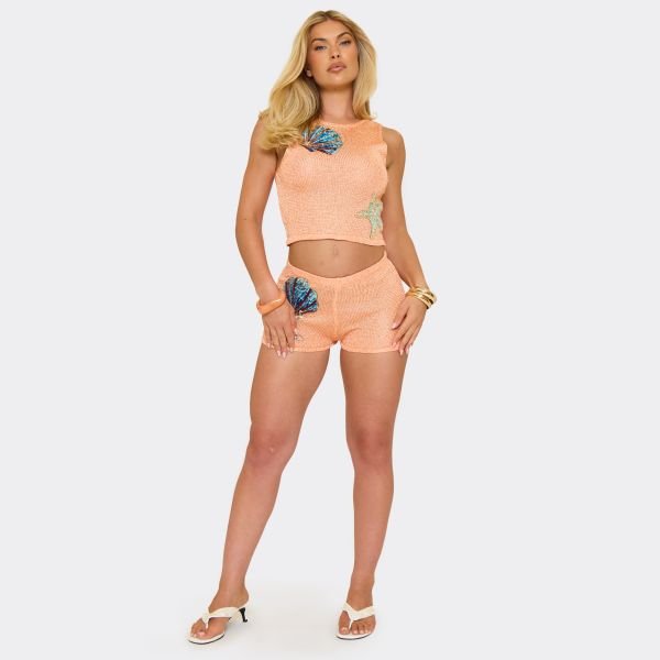 The EGO Mid Rise Shell Applique Detail Shorts in Orange is ideal for beach, casual, summer.