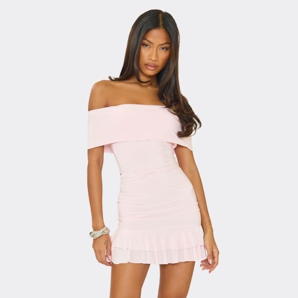 Step into the spotlight with this ultra-dreamy mini. Featuring baby pink pleated material, Bardot open back detailing, and a ruched bum finish, this dress is essential for your next 'it-girl' moment. Style with platform heels and a mini bag.