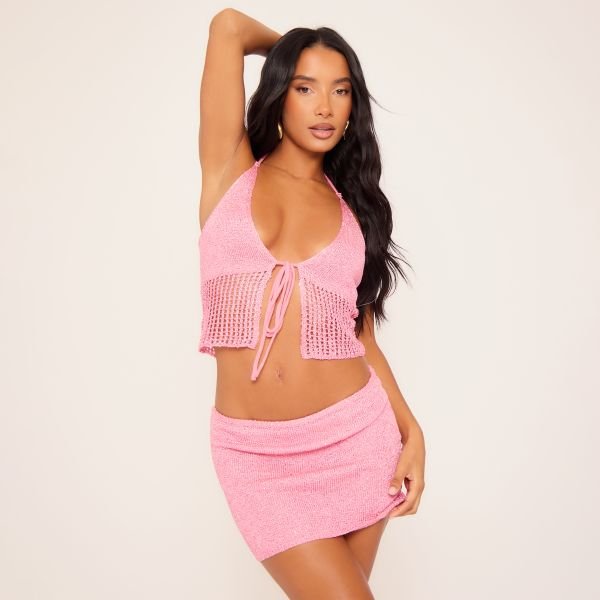 The EGO Halterneck Tie Front Detail Top in Pink Glitter Knit is available in sizes L, M, S.