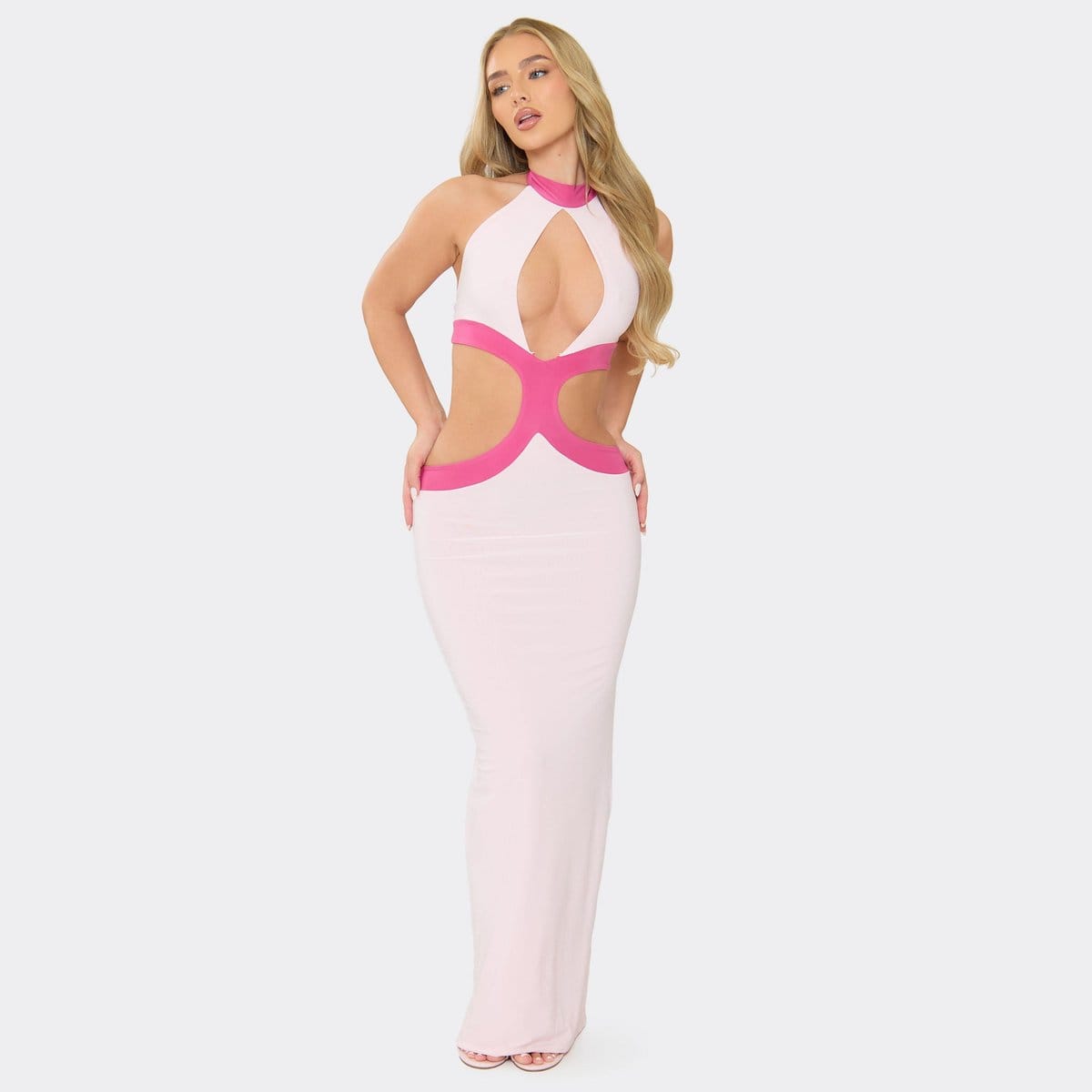 The EGO Pink High Neck Plunge Cut Out Detail Contrast Maxi Dress is ideal for evening, party.