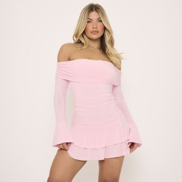 Make an entrance in our pink slinky long sleeve Bardot mini dress. This bardot pink mini dress features a figure-hugging silhouette. Perfect for your weekend wardrobe.