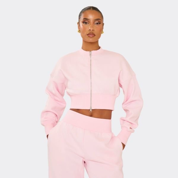 Designed with baby pink, long sleeves, and a zip-up detailing, this top brings effortless it-girl energy. Ideal for casual-cool vibes, pair it with matching joggers and trainers for a bold, off-duty finish.