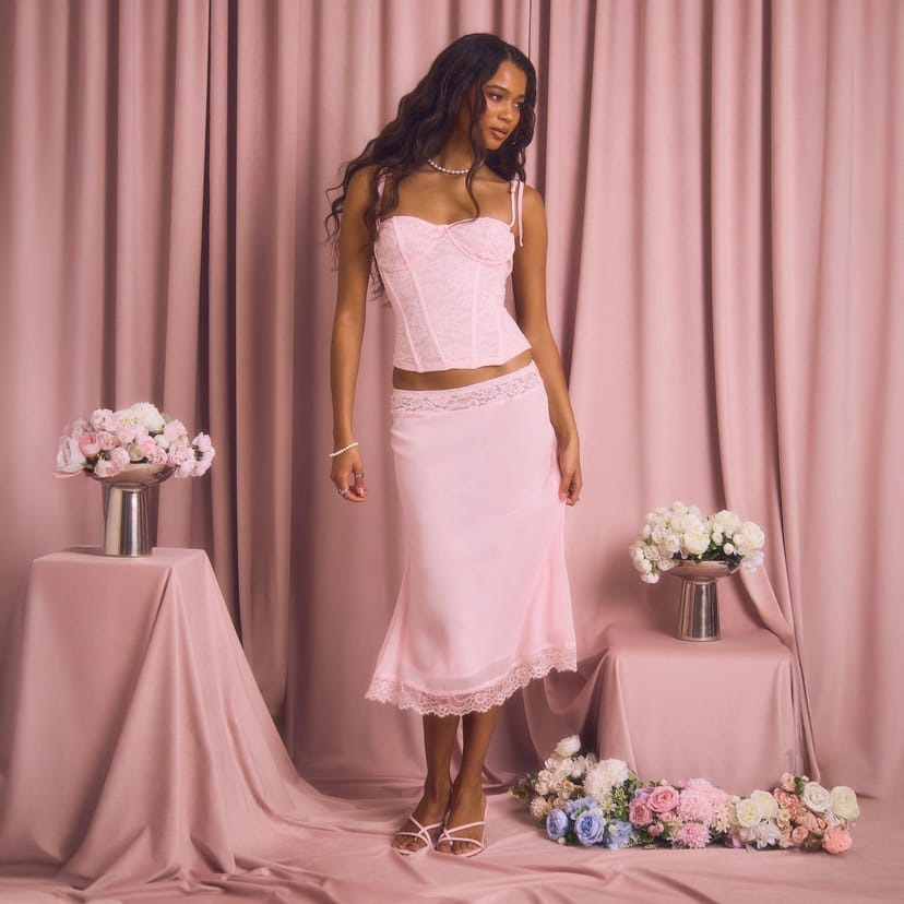This pink chiffon midi skirt from EGO features delicate lace trim and a low-rise design. Ideal for summer parties or sunset drinks, style it with the matching corset top and kitten heels for a complete look.