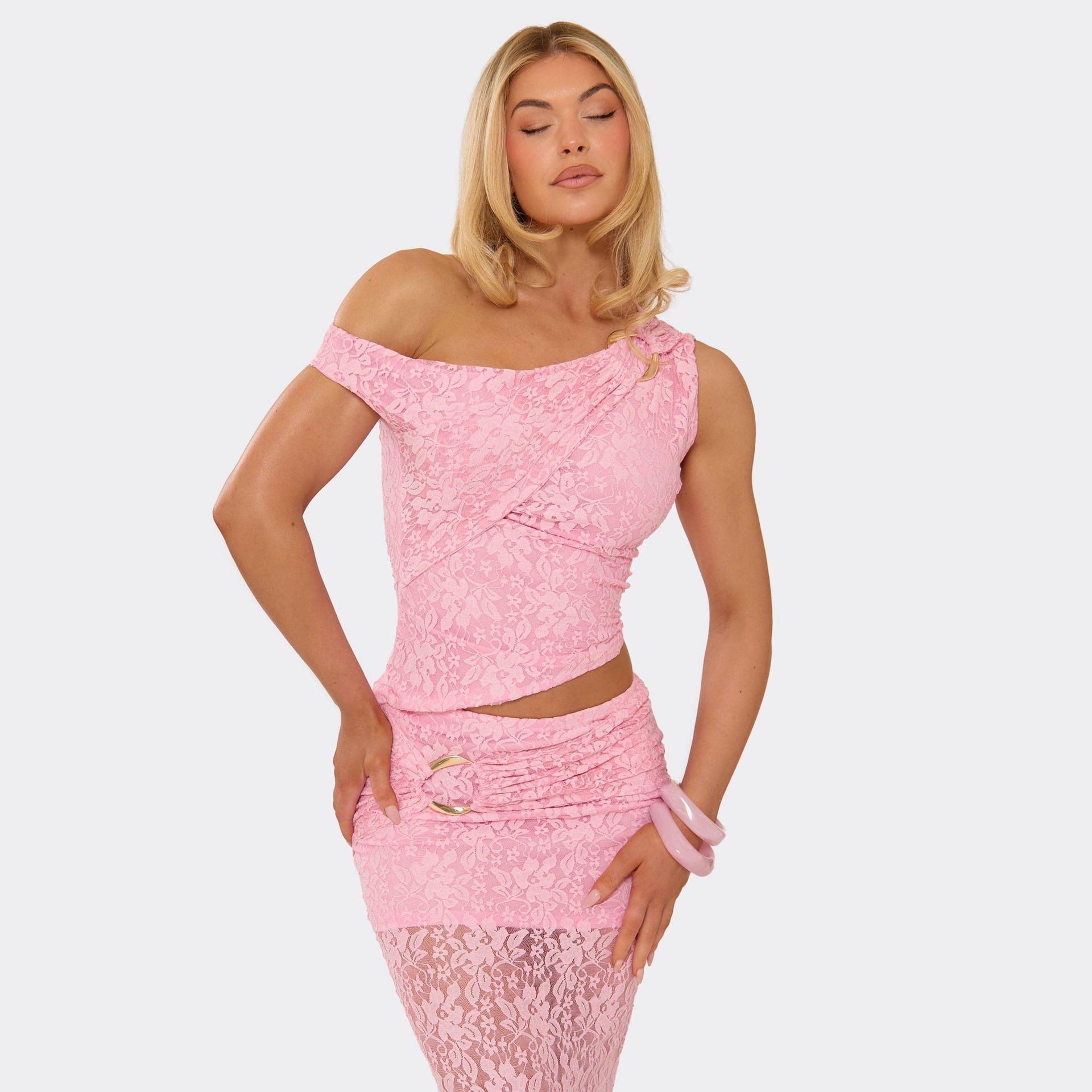 “Pair with pink lace-up heels and a matching clutch for a cohesive look.”