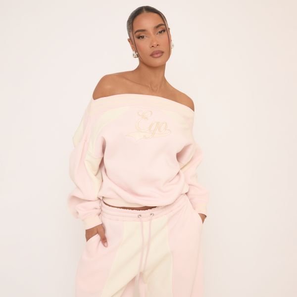 Elevate your everyday vibe with our Oversized Bardot Contrast Stripe EGO Graphic Sweater in Pink. This pink off the shoulder jumper keeps you cute and comfy with a chic bardot neckline, cream contrast stripe, and luxe EGO graphic. Style this oversized sweatshirt with the matching joggers to bring attitude to your chill days!