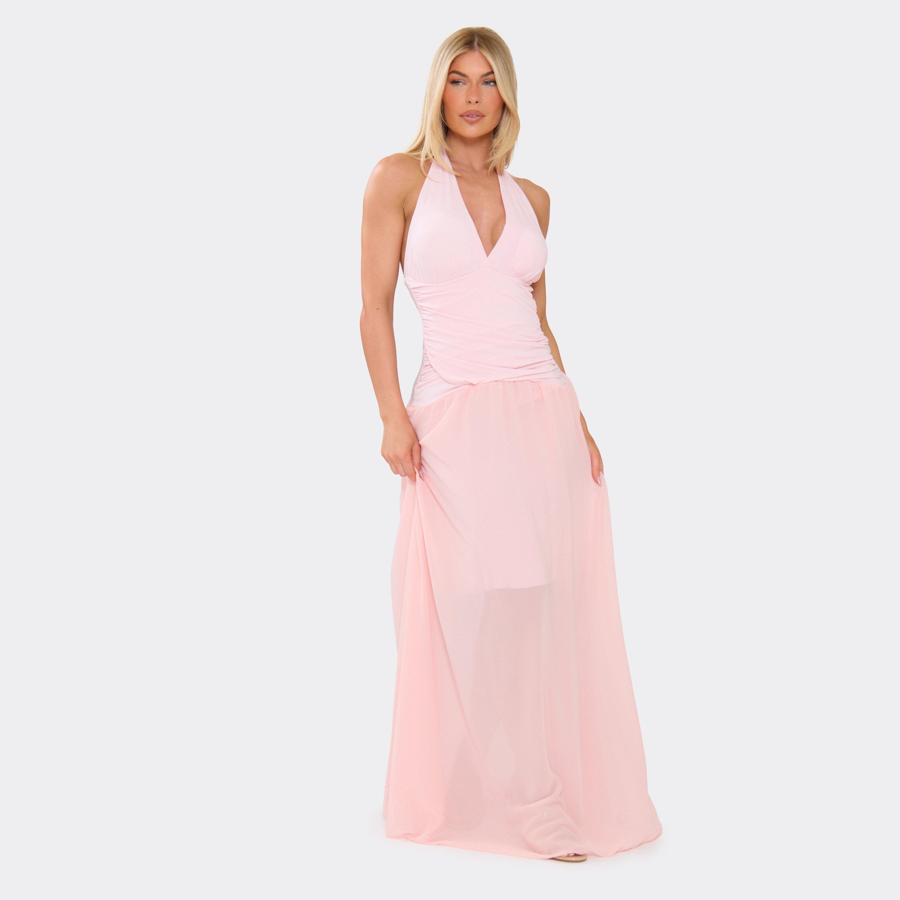 Designed in pink, this maxi dress features a plunge halterneck and dropped waist detailing, perfect for a glamorous evening look.