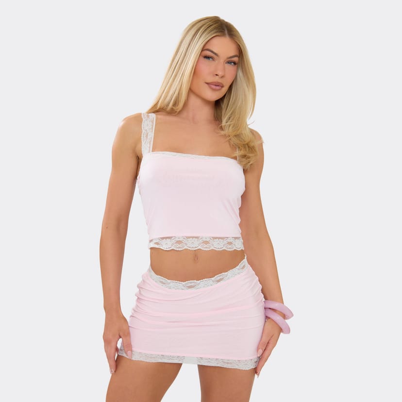 Elegant pink slinky cami top featuring lace trim and a square neckline. Ideal for a night out, pair with a denim mini skirt and clear heels for a chic, on-trend look.