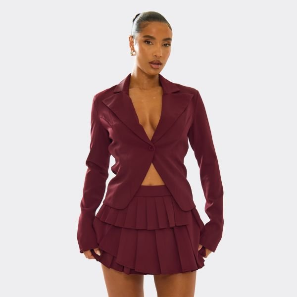 Designed with plum woven material and cinched waist detailing, this long sleeve blazer is perfect for date nights. Its bold, chic vibes make it a standout piece for making an entrance.