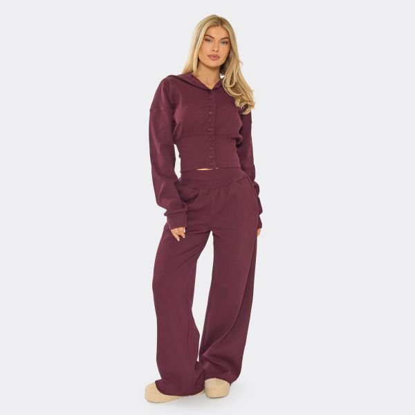 Combine comfort and style with these plum ribbed joggers, featuring a low-rise waist and wide-leg fit. The elasticated waistband ensures a secure fit while maintaining a relaxed, modern silhouette. Ideal for a chic yet comfortable airport outfit.