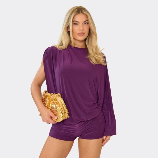 The EGO Elegant Plum Slinky One Sleeve Drape Top is ideal for evening, casual, date-night.