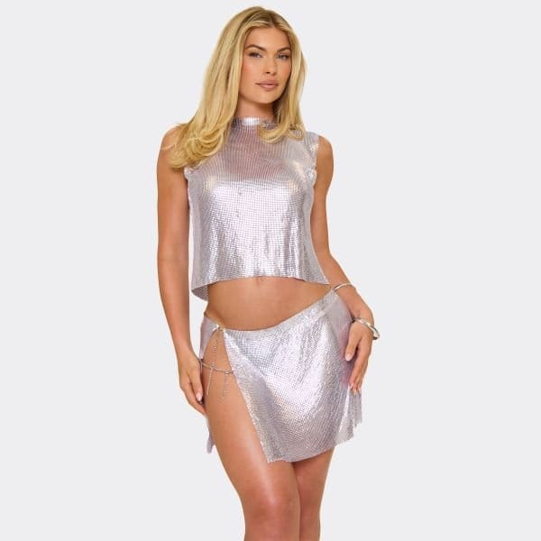 Serve edgy vibes, doll! Featuring lilac chainmail fabric with a sleeveless cut and open back detailing, this top brings bold, chic energy perfect for standout nights and statement days.