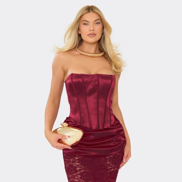 The EGO Burgandy Satin Bandeau Corset Top in Burgandy is ideal for evening, party, date-night.