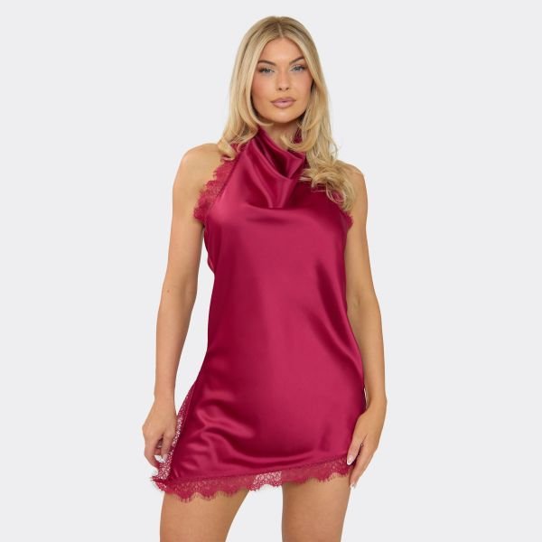 Designed with burgundy satin, this mini dress features a high cowl neck and asymmetric lace trim detailing. Perfect for dinner dates or any special occasion