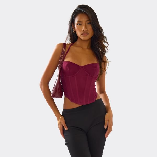 Designed for the night out, this top features a plum mesh material with corset and halterneck detailing plus a dipped hem finish. Perfect for adding drama with a chic edge to your party wardrobe.
