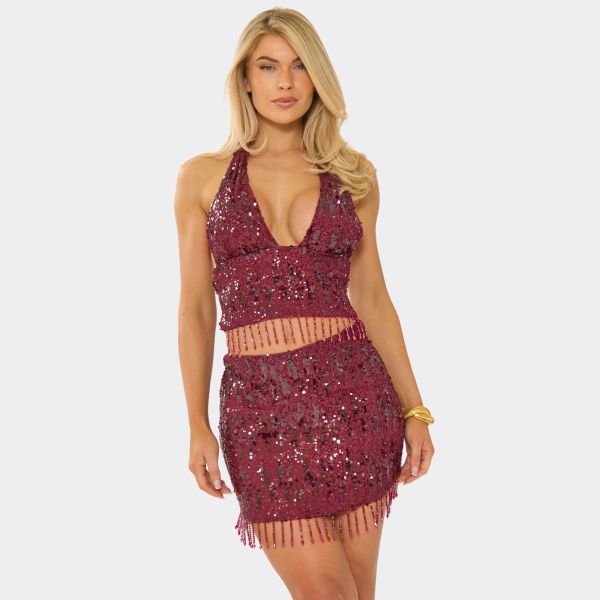 The EGO Halterneck Crop Top with Bead Trim in Burgundy Sequin is ideal for evening, party.