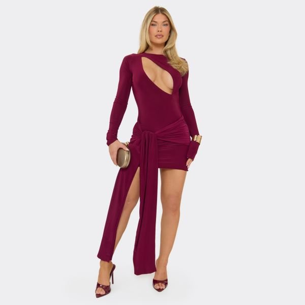 Red Long Sleeve Cut Out Front Drape Detail Mini Dress — perfect for a night out. Featuring burgundy stretch material with long sleeves, cut out front, and drape mini dress detailing. Sleek and statement-style for a memorable evening. Designed in vibrant burgundy, this mini dress has an elegant silhouette and is made from a stretchy material for comfort and fit. Ideal for parties, evening events, and stylish night plans.