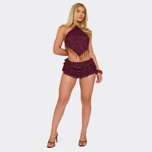 Designed for a bold look, these burgundy textured micro shorts feature a low rise and layered detailing. Perfect for statement nights, they bring chic, standout energy to any outfit.
