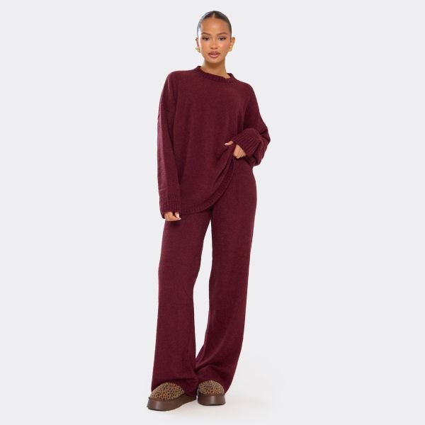 The EGO Cozy Knit Mid Rise Wide Leg Trousers in Burgundy is available in sizes S.