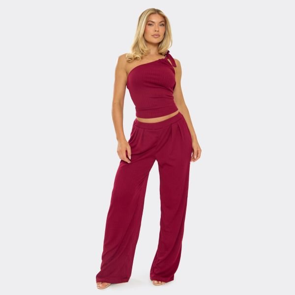 Step into your romantic era with a burgundy co-ord trouser set. Designed for date nights, this trouser co-ord blends chic and sexy style. Crafted in a rich burgundy tone, it boasts a one-shoulder tie detail top and wide-leg trousers.
