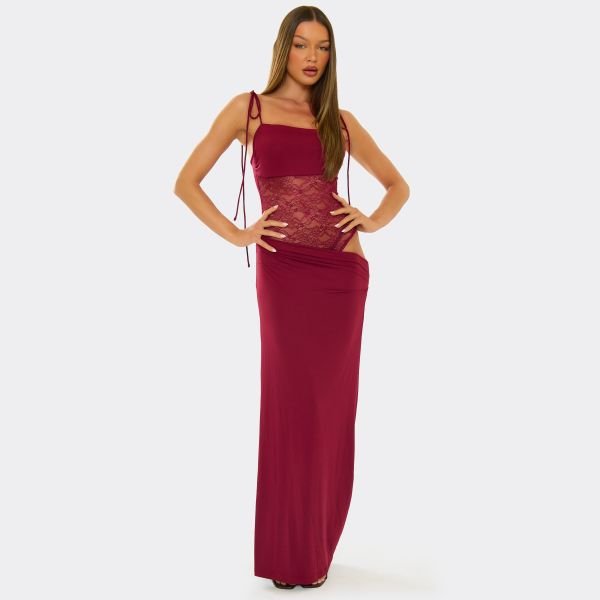 Featuring a burgundy material with strappy and contrast lace panel detailing, this maxi dress is perfect for statement night-out moments. Ideal for those who love to make a bold fashion statement.