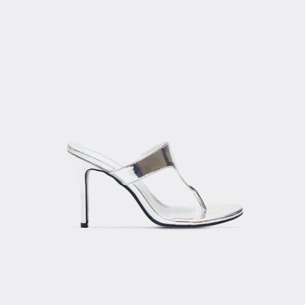 Get ready to turn heads at your next big night out. Featuring silver patent material with thong strap detailing and a killer stiletto heel, these mules are a total mood. Style with a metallic mini skirt and a baby tee for an iconic it-girl aesthetic.