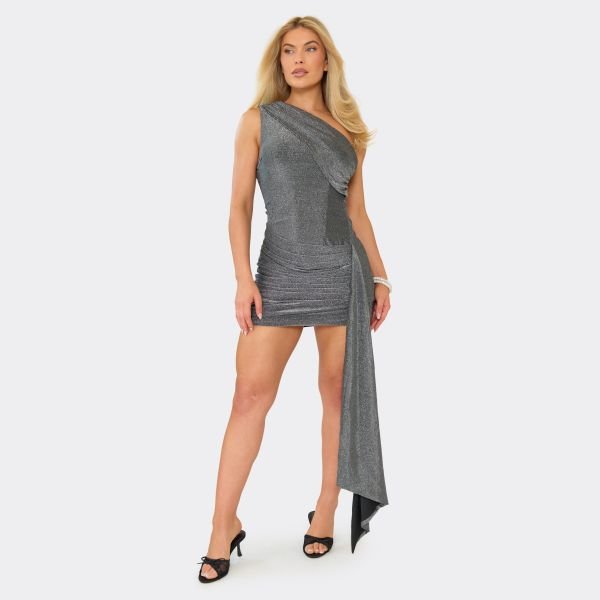 The EGO One Shoulder Ruched Drape Detail Mini Dress in Silver Glitter is ideal for evening, party, work event.