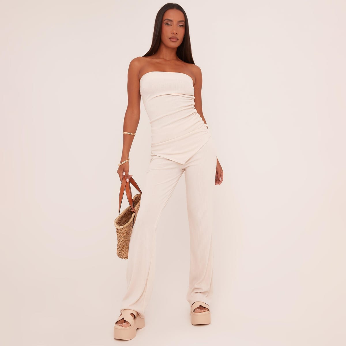 The EGO Stone Texture Bandeau Asymmetric Top and Trousers Co-Ord Set is ideal for casual, evening.