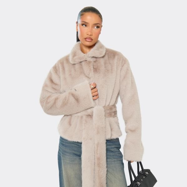 The EGO Collared Tie Waist Detail Jacket in Stone Soft Faux Fur is available in sizes L, M, S.