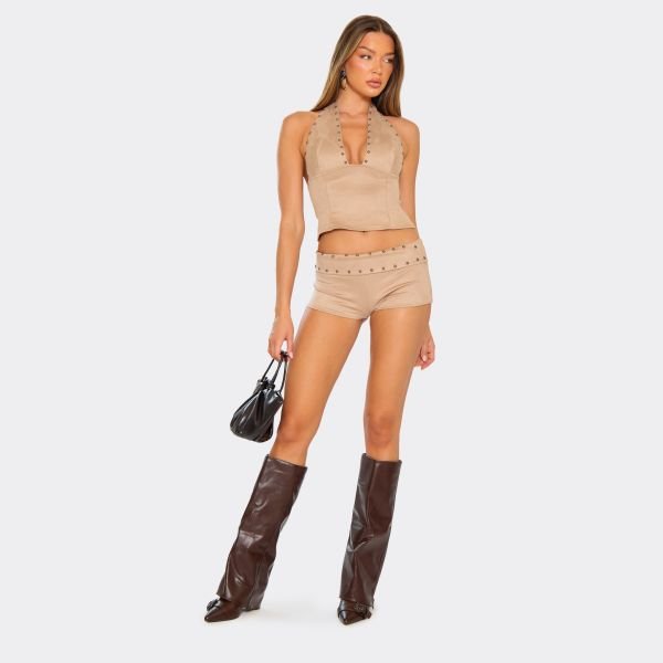 The EGO Stud Detail Low Rise Hot Pants in Stone Faux Suede is ideal for night-out, casual.
