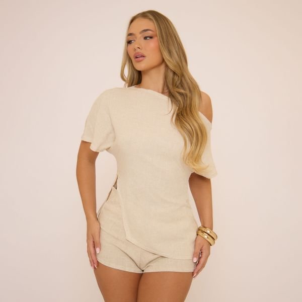 The EGO Off-Shoulder Asymmetric Detail Top in Stone is ideal for casual, weekend.