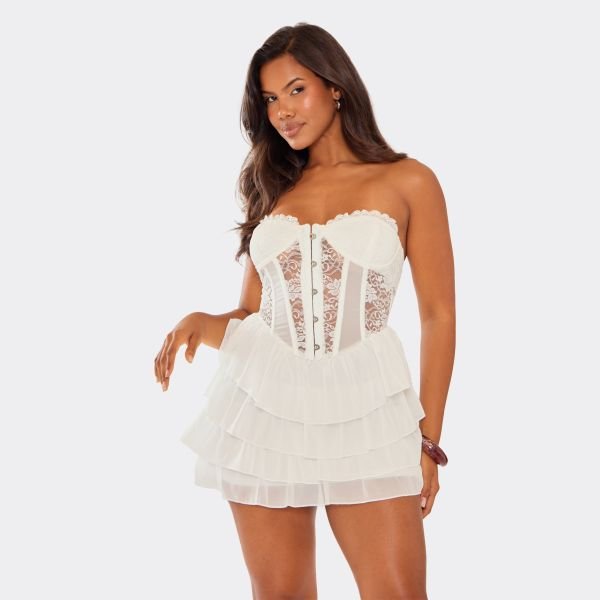 The EGO Bandeau Frill Hem Lace Corset Mini Dress in White is ideal for party, engagement.