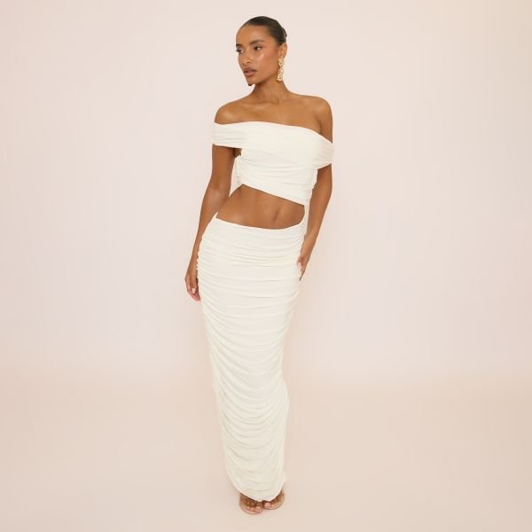 Make an unforgettable entrance in our white cut out maxi dress with Bardot styling. This stunning silhouette features ruching and asymmetric cut-out details. Perfect for elevated glam.