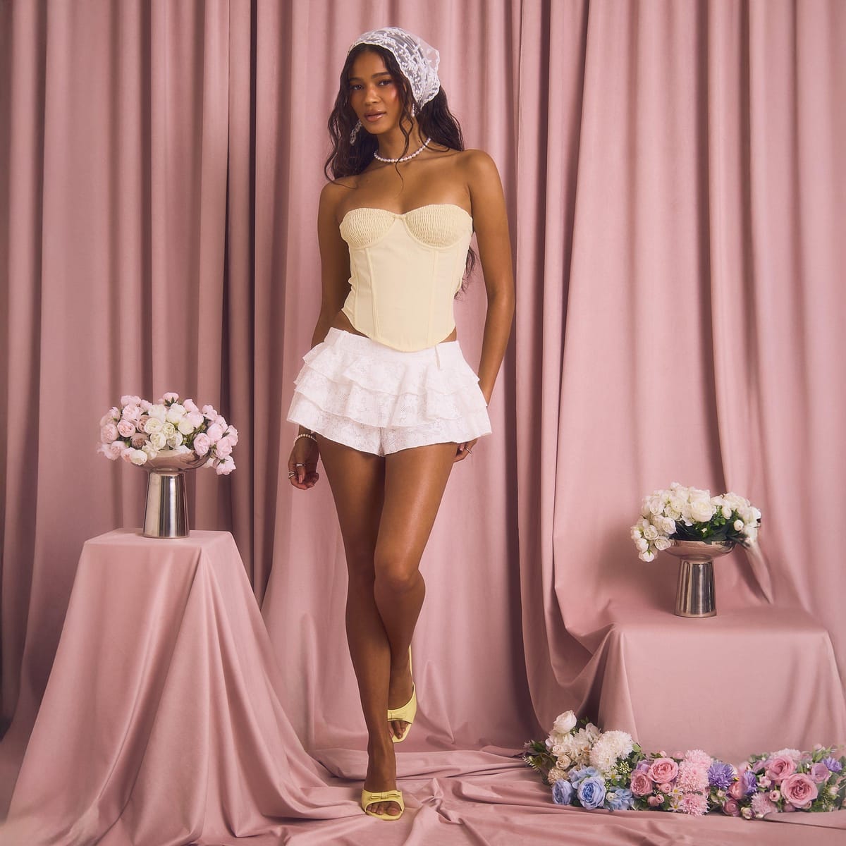 Style with a cream corset top and yellow Western boots for a boss-babe look.