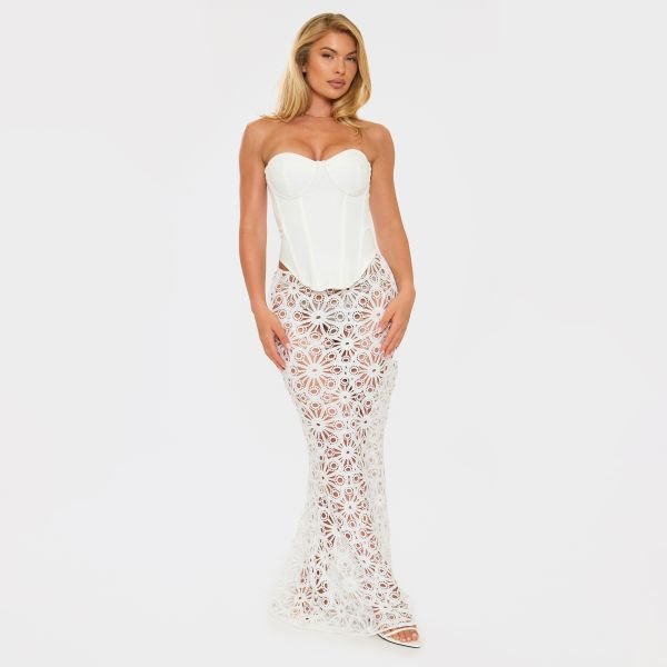 The EGO Boho Chic Fishtail Maxi Skirt in White Crochet Lace is ideal for beach, weekend.