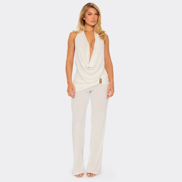 The EGO Ruched Panel Trim Detail Straight Leg Trousers in White is ideal for evening, formal.