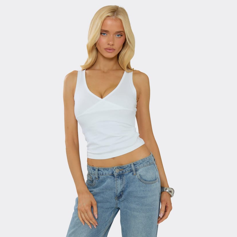 Refresh your summer rotation in white material featuring a sleeveless design and wrap front detailing. This sharp, edgy top delivers a total clean-girl aesthetic for a major it-girl finish, featuring a plunge neckline. Perfect for casual outings or adding a touch of edge to your summer wardrobe.