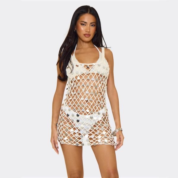 Going somewhere warm? Take this white netted dress with you. It’s one of those beach cover-up outfits that could totally pass as your holiday evening outfit. Here to bring the heat, this crochet dress features a square neckline to give your chest the moment, plus light-catching sequin embellishments. Made from a soft, crocheted fabric, this mini dress is designed with a bodycon style that works wonders for your silhouette.