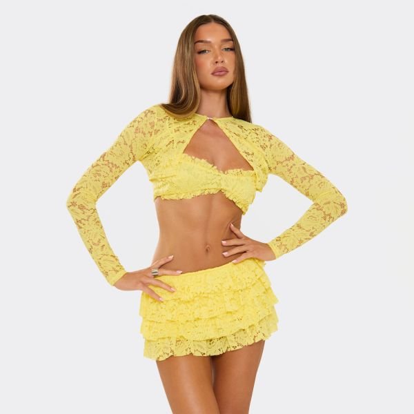 Designed with vibrant yellow lace, this top features a button neck, long sleeves, and a split front detailing. Perfect for adding a playful touch to your outfit.