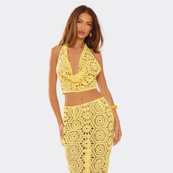 The EGO Crochet Cowl Halterneck Crop Top in Yellow is ideal for casual, beach, party.