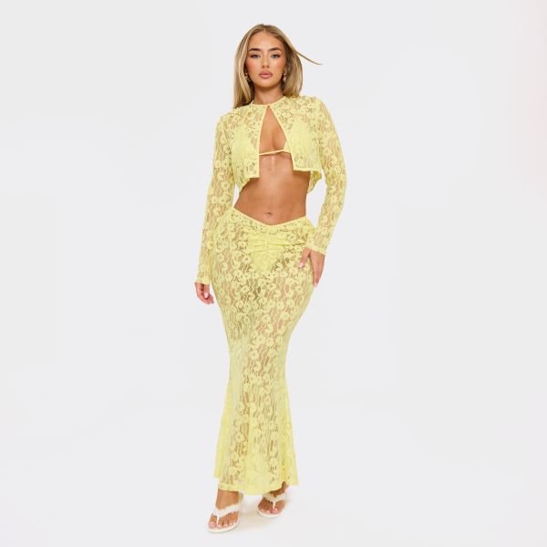 The EGO Dipped Waist Ruched Front Maxi Skirt in Yellow Lace is ideal for party, evening, casual.