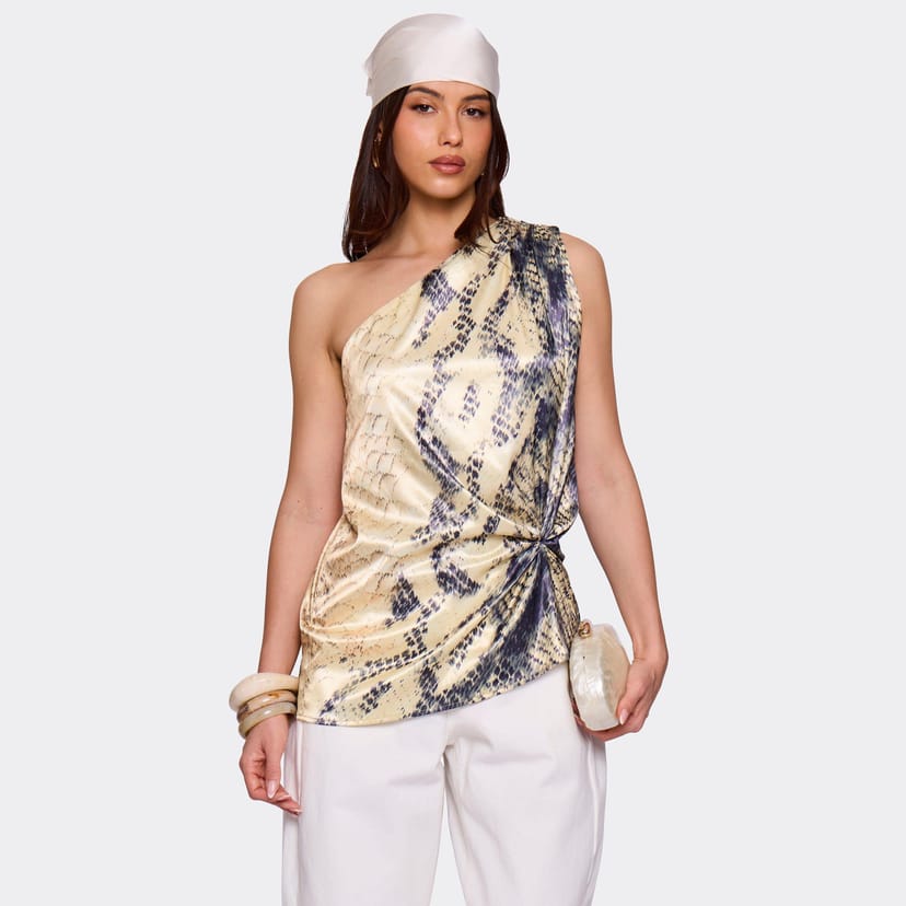 Stylish one-shoulder knotted top in yellow printed satin. Features a unique knot detail and a flattering silhouette. Ideal for evening events or special occasions.