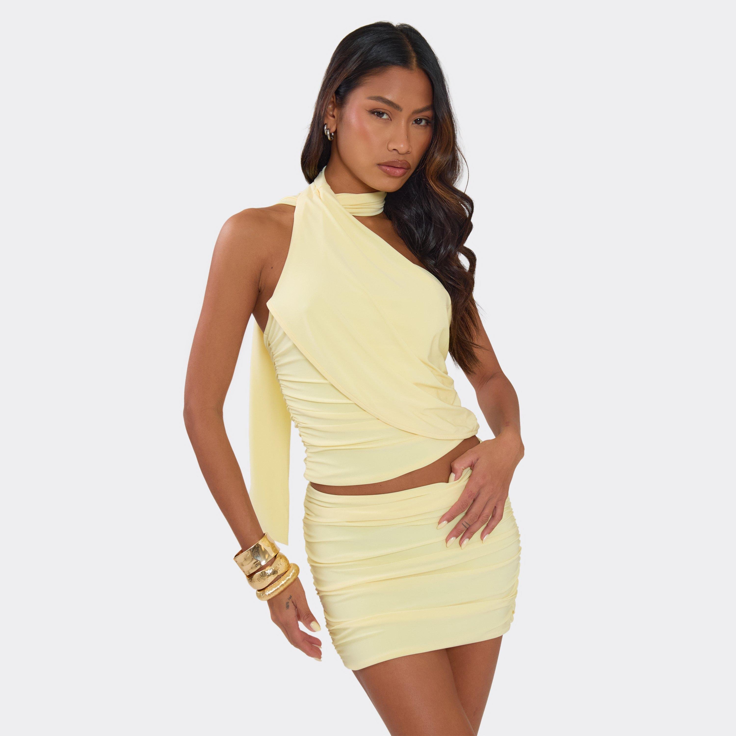 The EGO One Shoulder Wrap Neck Draped Detail Ruched Top in Lemon is made from polyester, elastane.